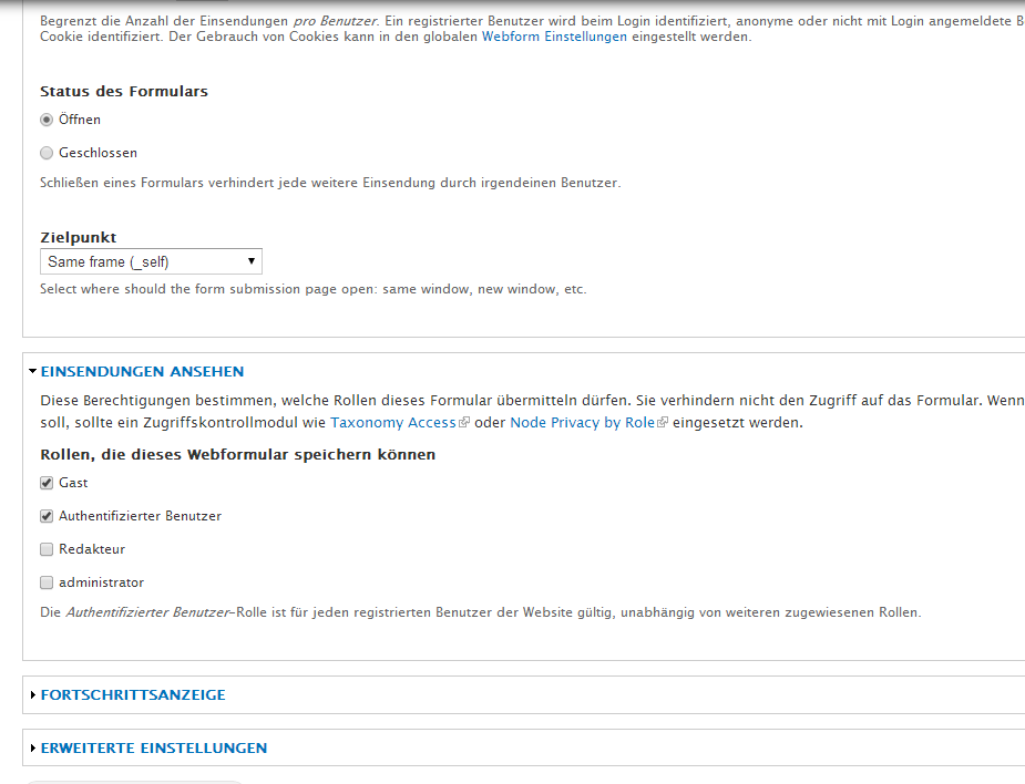 Wichtig ist hier auch der Bereich Submission Access in der Konfiguration der Webform - dieser sollte auf Anonymous User eingestellt sein, um auch von Gästen Webforms abschicken lassen zu können.