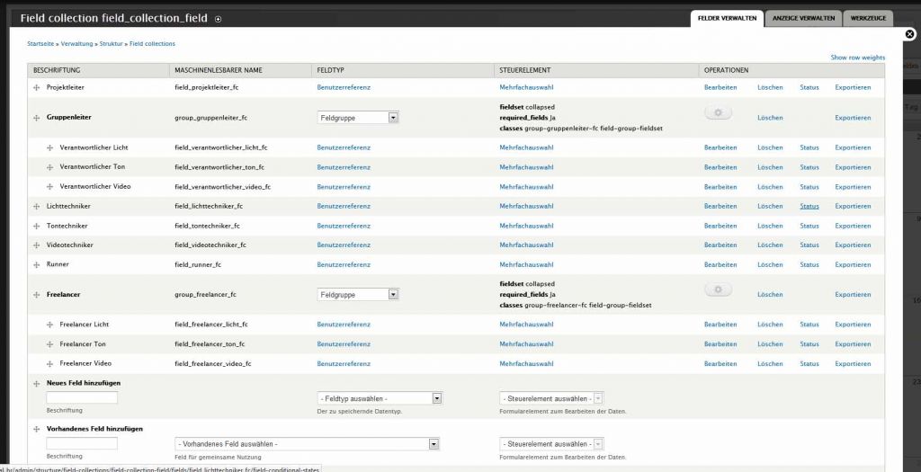 1: Produktion (Felder: Titel, Ort, Datum, Mitarbeiter by User Reference. Es sind acht Gruppen daher auch 8 User Reference Felder. Eingebettet in Field Collection (Bild1)).