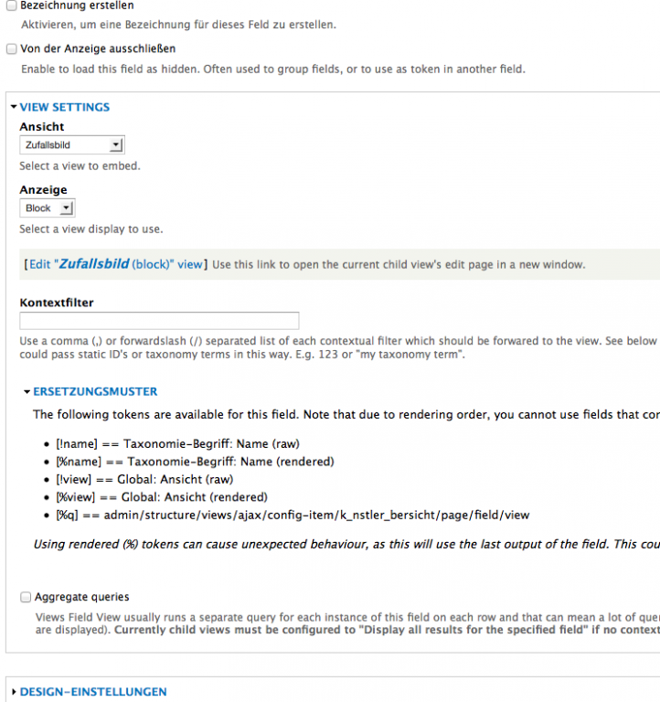 View 1 zeigt alle Künstler an (Taxo-Terms) und der eingebettete Views 2 zeigt zu jedem Taxo-Term ein Zufallsbild an! Du filterst über Contextual ( Views 2) dann die Taxo-Terms welche du im "Views Field" (View 1) übergibst ....