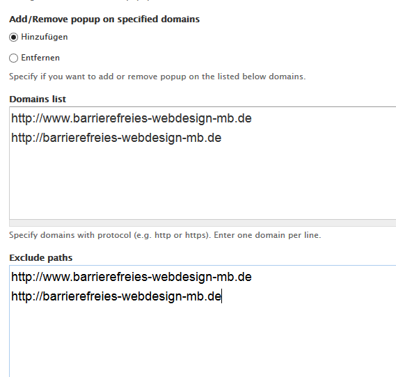 Die URL Eintragungen aus beiden Feldern löschen - das include ist nur dafür da, wenn du den Popup nur bei bestimmten Einstiegsseiten platzieren willst oder in bestimmten Fällen auf bestimmten Einstiegsseiten zb. nicht.