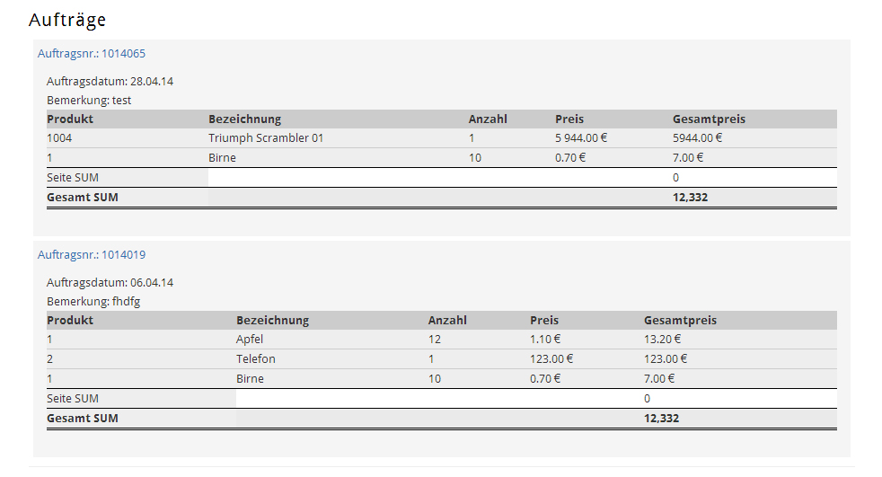 Tabellen untereinander (Gruppiert nach Auftragsnummer). Wenn ich nun aber die Gesamtsumme errechnen lassen möchte, dann errechnet
