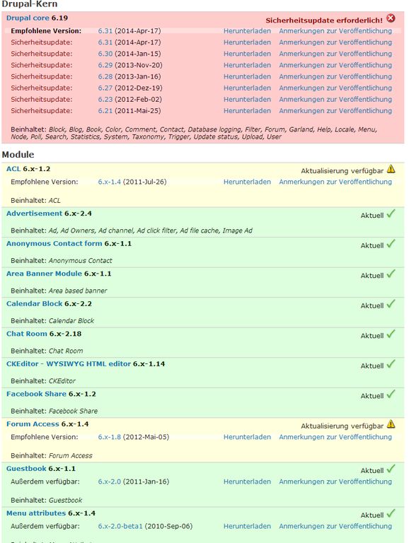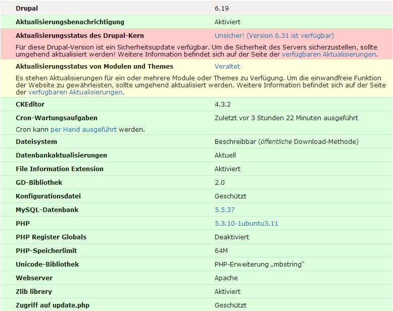 Einige Tage später erhielt ich ständig Fehlermeldungen vom Captcha-Modul (die ich leider nicht notiert habe). Bei genauerer Betrachtung stellte sich heraus, das die Drupalinstallation offenbar der Meinung ist, dass der Core hoffnungslos veraltet ist (6.19) obwohl ich kurz zuvor erst auf 6.30 upgedated hatte. Ausserdem meldeten mehrere Module eine veraltete Version. Auch hier lies sich eindeutig belegen, dass die gemeldeten Versionen nicht mit den tatsächlich installierten überein stimmten.