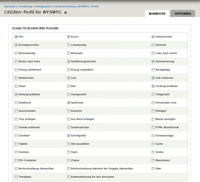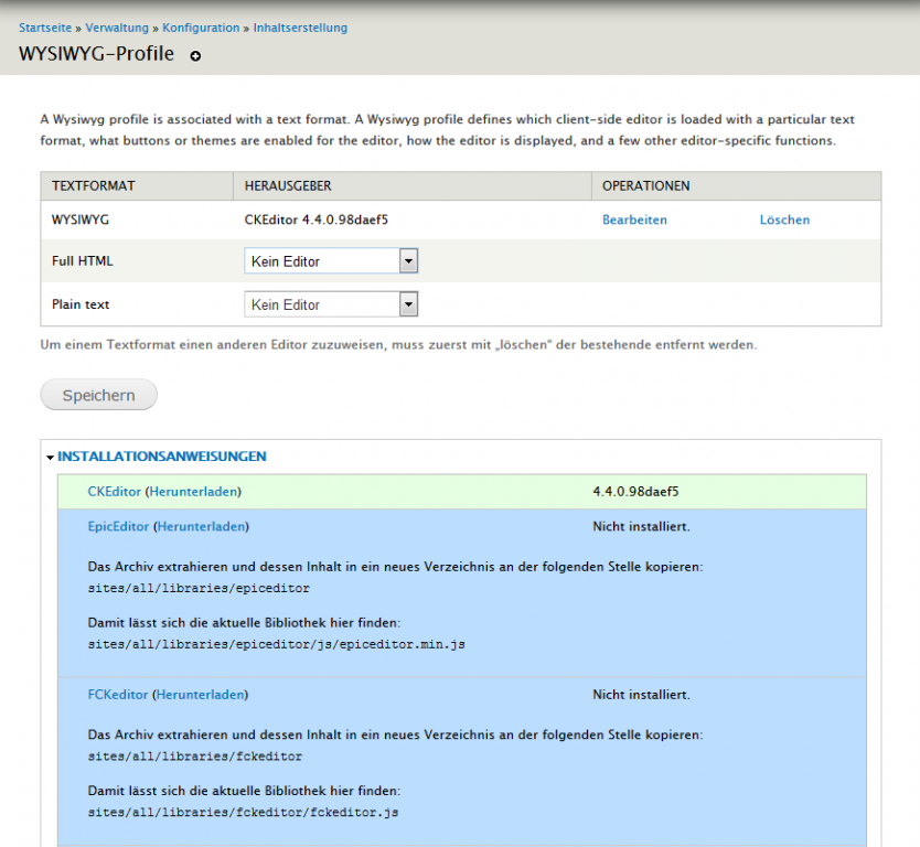 Unter dem Link deinedomain.de/drupalordner/admin/config/content/wysiwyg kann anschließend einem Textformat der Editor zugeordnet werden.