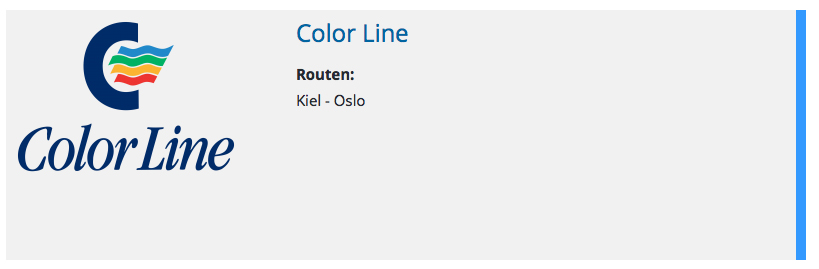 Dh Man soll nach Ländern filtern und dementsprechend die Reederei gezeigt bekommen, die das Land auch anfährt. In dem Ergebnis, hier die Reederei "Color Line" brauche ich ein Feld, das mir Child #2, also die Route der Reederei anzeigt.