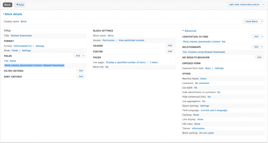 Ich habe einen View angelegt mit einem File-Field. Und den View lasse ich über einen Block in der rechten Spalte ausgeben.