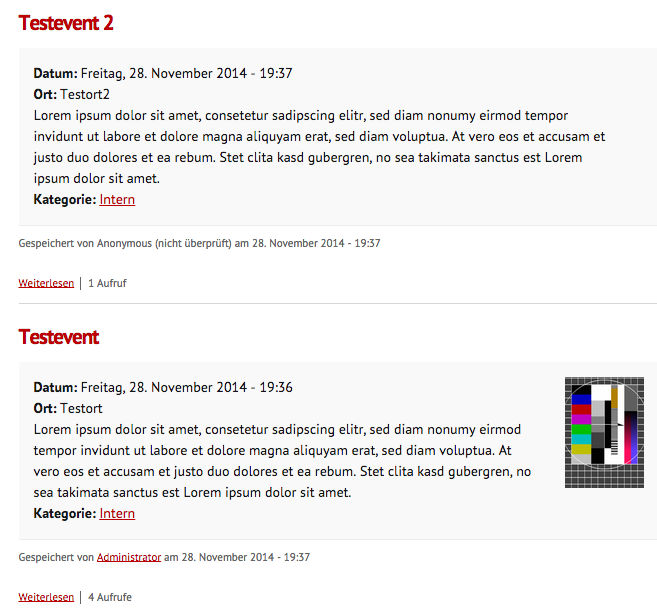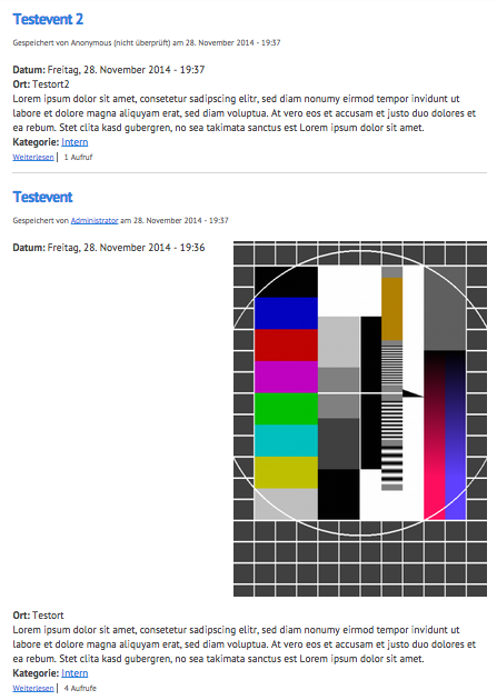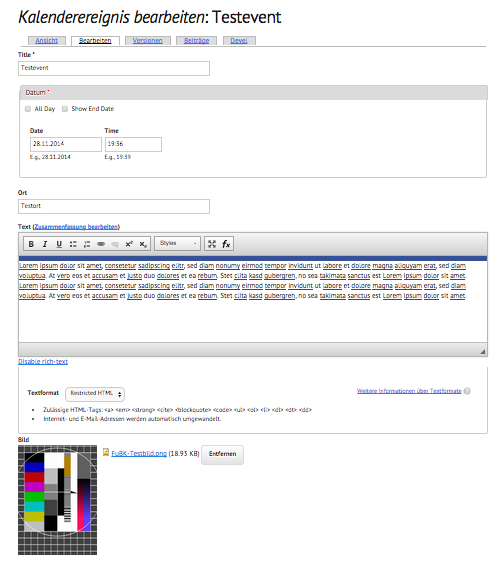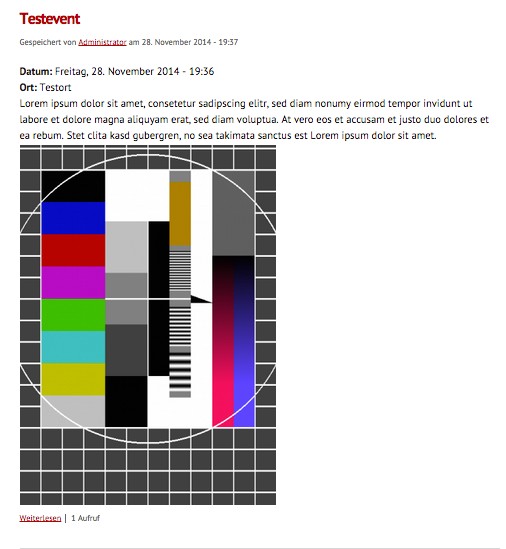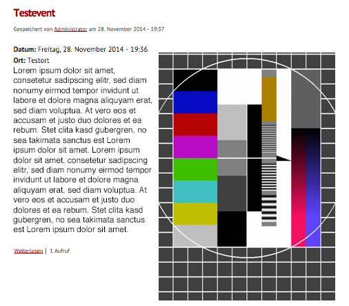 Was nicht schön ist, dass das Bild einfach so unter dem Text steht. Oder darüber (je nachdem wo ich das Feld hinschiebe). Ich möchte aber, dass das Bild schön rechts vom Text zu sehen ist, also umflossen wird. Das soll automatisch geschehen. Der Nutzer soll pro erstelltes Event ein Bild auswählen, und das wird automatisch schön an die richtige Stelle eingefügt. Ein rumfummeln im WYSIWYG-Editor kann ich leider nicht zumuten.