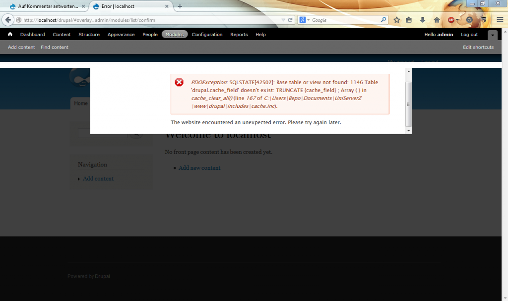 Ich habe dann mal meinen Localhost/Webserver neu installiert und dann nochmal Drupal installiert (diesmal wieder im ganzen Umfang).