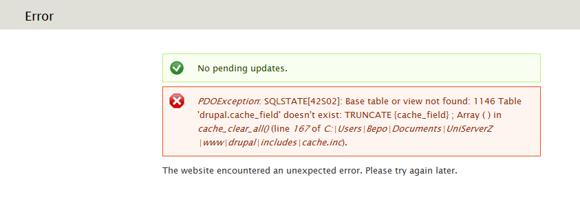 Mir scheint, dass Du mit den Datenbanken durcheinander kommst, kann das sein? Die Fehlermeldung sagt es ja: in der Datenbank drpl gibt es keine Tabelle cache_field. An dieser Stelle nur diese eine Fehlermeldung hier anzugeben bringt nichts, die anderen Fehlermeldungen wären auch wichtig.