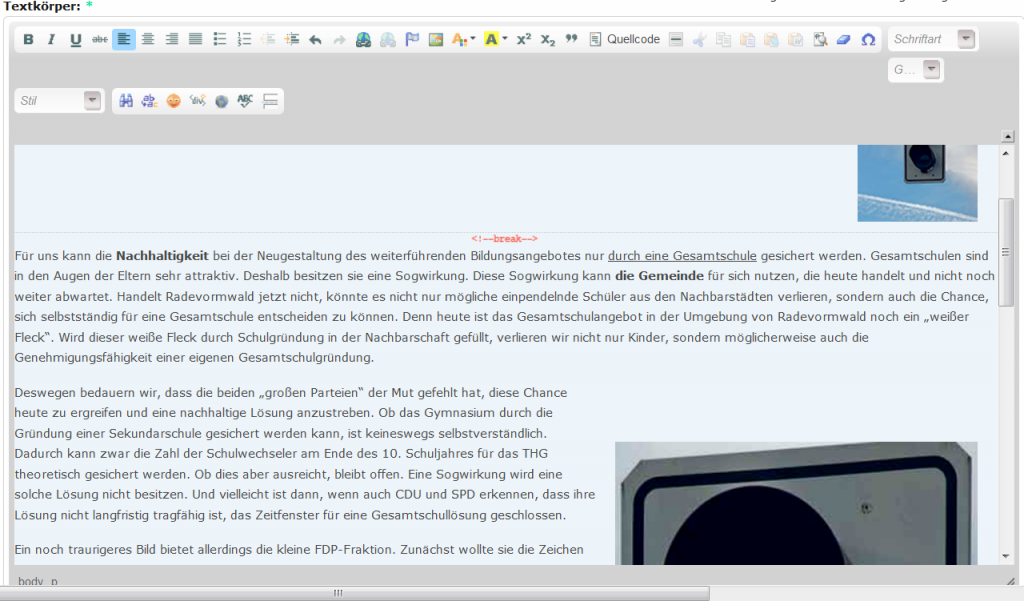 Das Problem kann auch eigentlich nicht ein Problem des Editors sein. Ich habe heute ältere Texte, die ich in den letzten Tagen nicht angerührt hatte kontrolliert. Die Bilder und Schriftauszeichnungen werden im Editor dargestellt und sind auch im Quelltext in html richtig dargestellt.