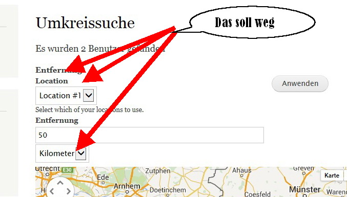 Nachdem ich mich durch sämtliche Suchergebnisse in Google und den Foren gewühlt habe, funktioniert nun die Umkreissuche für User mit zentrierter Ausgabe der map. Allerdings habe ich nun bei den Filtern die Auswahl der Location, was absolut störend ist, da jedes Mitglied nur eine einzige Location besitzen kann. Das verwirrt und ist absolut überflüssig. Leider finde ich keinerlei Optionen, die Location Auswahl zu deaktivieren. Weiß jemand eine Einstellung oder einen Patch oder bleibt mir nur der Weg über ccs und visibility:hidden?