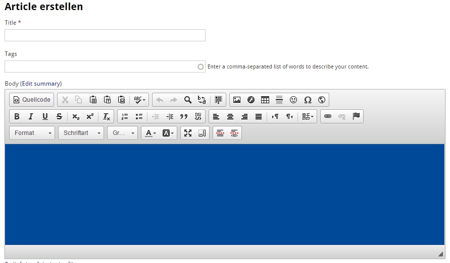 Wenn ich einen Bericht anlegen möchte, erscheint zuerst kein Editor, wenn ich ein Bild hochlade (über den Feldtyp Bild, also nicht im Textbereich) wird mir anschließend der CKEditor angeboten. Bei Basic Page bekomme ich den CKEditor nie angezeigt.