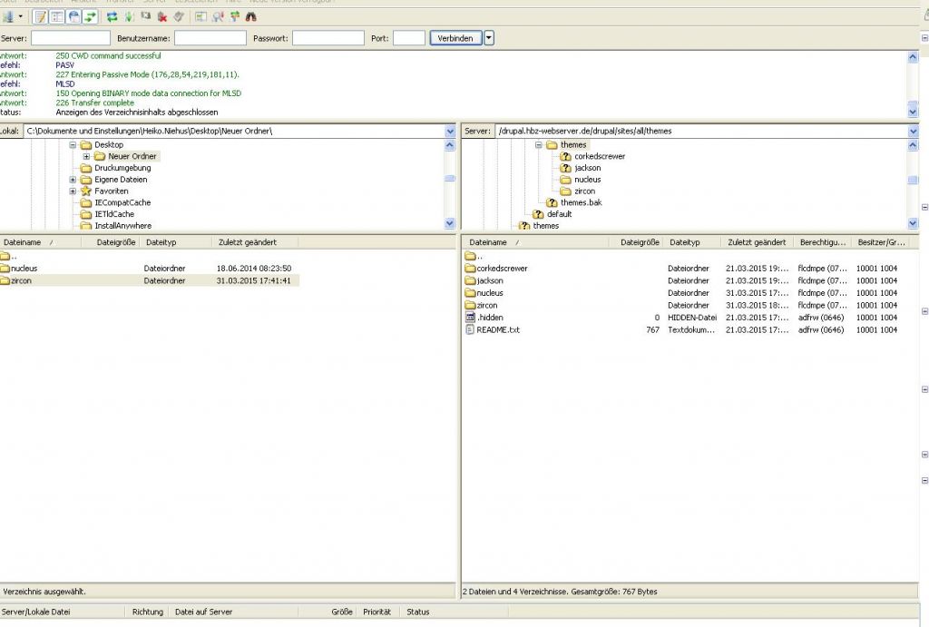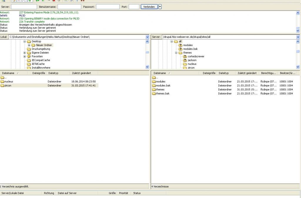 Wollte das Theme ändern, habe mit ZIRCON von drupal.org gedownloadet und per FTP in das Verzeichnis /sites/all/themes verschoben. Die Anmeldung am Bachend funktioniert tadellos, ich habe unter Verwaltung das neue Theme als Standard definiert. Anscheinend ist was schief gegangen. wenn ich jetzt zur Anmeldung www.drupal.hbz-webserserver/drupal gehe bekomme ich nur einen weißen Bildschirm.