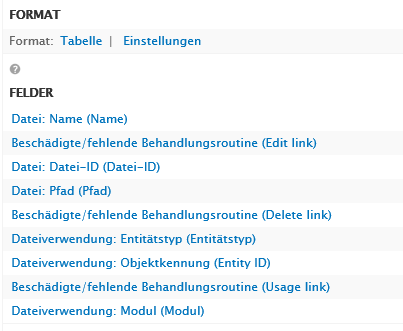 Name, Edit Link, Datei ID, ---, Pfad, Usage Link