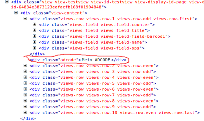 Du überschreibst am besten die entsprechende views Template Datei mit einer fixen Position für den Ad Code. In diesem Beispiel wird der Custom String 'Mein ADCODE' an Position 3 innerhalb der View ausgegeben:
