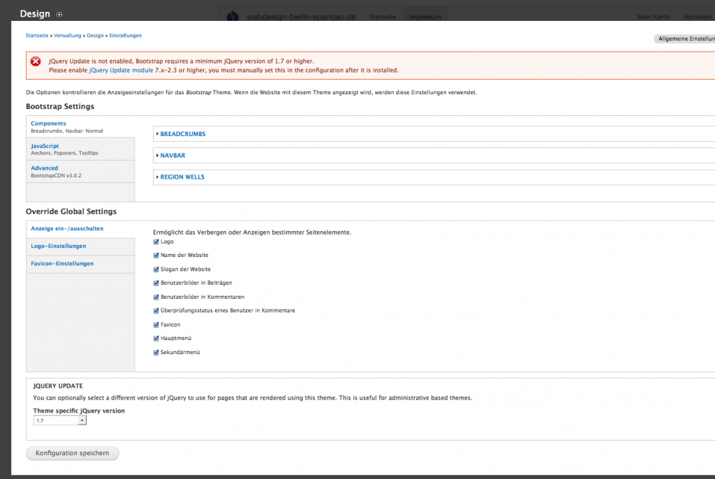 Allerdings habe schon das jQuery update 7.x-3.0-alpha2 installiert und Theme specific jQuery version auf site default 1.10 gestellt. (cache geleert und cron habe ich auch durchgeführt)