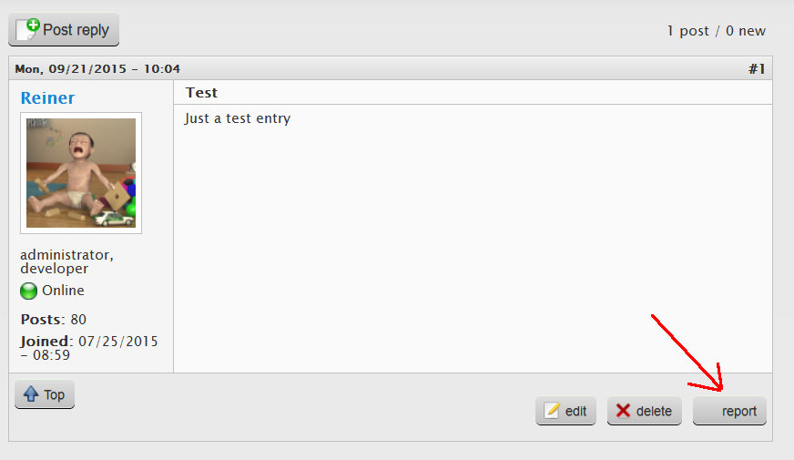 Angefangen hatte es mit dem Melden Button. Siehe Anhang. Das ist auch eigentlich nach wie vor das wichtigste Ziel. Denn im ungünstigsten Fall schaue ich mal ein paar Tage nicht nach ob es Abuse Reports gibt. Das mit der Mailnachricht wenn jemand auf einen meiner Threads antwortet ist mehr ein Bonus. Und eigentlich auch mehr ein Test wo das Problem eigentlich liegt dass der Abuse Report keine Nachricht feuert.
