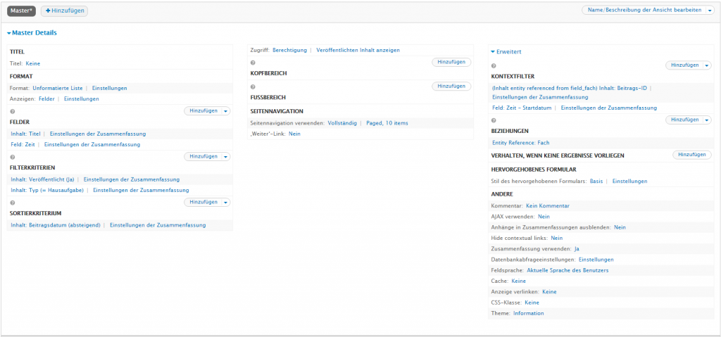 Diese View zeigt mir Hausaufgaben an, indem ich den Titel der Hausaufgabe und das Datum der Hausaufgabe ausgeben lasse, ich habe als Beziehung das Fach hinzugefügt und als Contextual Filter die Beitrags-ID als Beziehung erstellt, über das Views field view - Module kriegt er dann auch die entsprechende ID des Fachs. Das funktioniert. Er zeigt dann nur noch alle Hausaufgaben an und nur die in der 1. View zur passenden Woche.