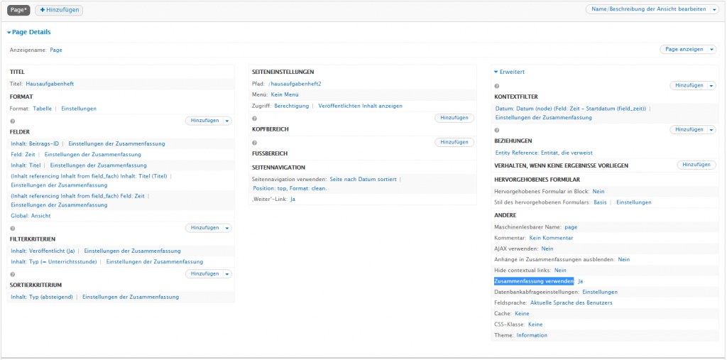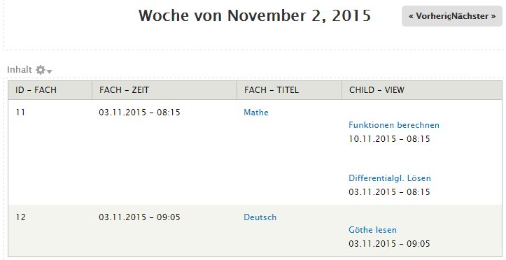 Also habe ich erstmal eine View erstellt, die mir die Schulfächer ausspuckt und das mit nem Contextual Filter den Standardwert auf Heute gesetzt, damit man bestimmte Wochen wählen kann. In dieser View werden die Felder: "Name des Fachs" und "Datum des Fachs" eingetragen. Mit der Einstellung in der View: "Zusammenfassung verwenden" zeigt er mir schon je nach Woche das richtige Datum aus dem Date Repeat Feld an. Außerdem habe ich in der View noch die 2. View als Feld