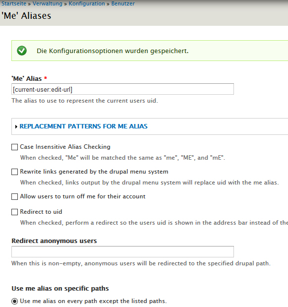 Wenn ich im me-Modul als Alias [current-user:edit-url] angebe und