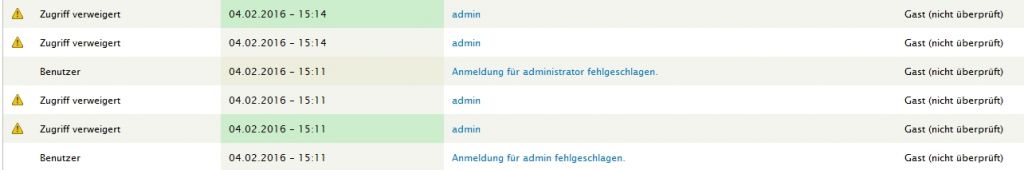 Falls ja: Habe dort 21 Seiten voller "Zugriff verweigert"-Meldungen und nur einige wenige plausible Vorgänge. Es sieht so aus, als ob sich jemand Zugriff verschaffen wollte, denn User admin oder Administrator gibt es aus Sicherheitsgründen auf der Seite nicht? Siehe Screenshot.