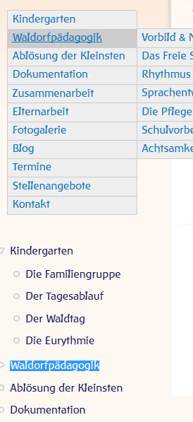 Auf der oben angegebenen Testseite lässt sich bei mir der Punkt "Waldorfpädagogik" im unteren Menü in der Sidebar beispielsweise auch nicht öffnen, obwohl ein Untermenü vorhanden ist (siehe angefügtes Bild zum Vergleich). Interessanterweise ist hier aber das Dreieck statt dem Kreis abgebildet. Im Nice Menü wäre es normalerweise rechts vom Text.