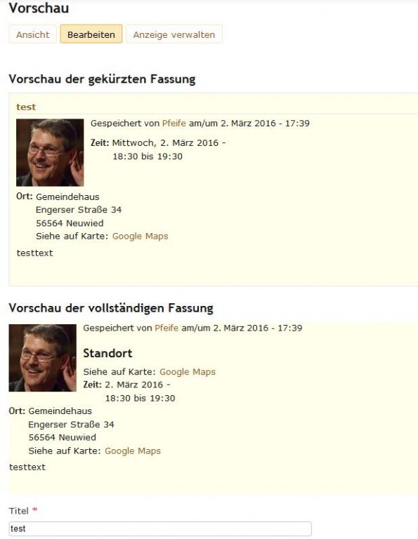 Wenn man das Eingabeformular ausgefüllt hat, kann man in der Vorschau alle Daten sehen, auch die Adresse, hinter der dann auch ein Link zu einer Googlemap steht.