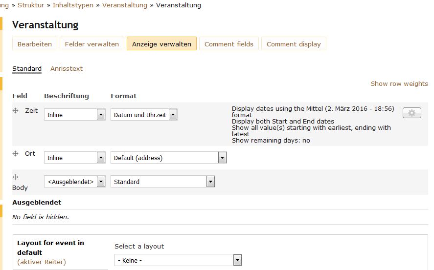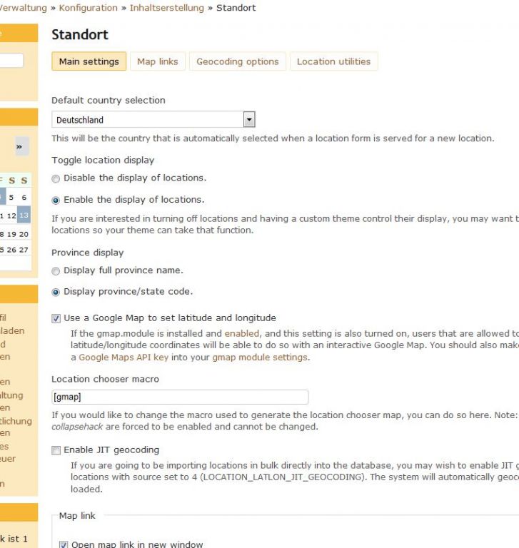 Wenn man einen neuen Termin eintragen will, wird bei Land: "Deutschland" Voreinstellung angezeigt. Das habe ich ja auch so eingestellt (siehe Anlage) auf /admin/config/content/location.