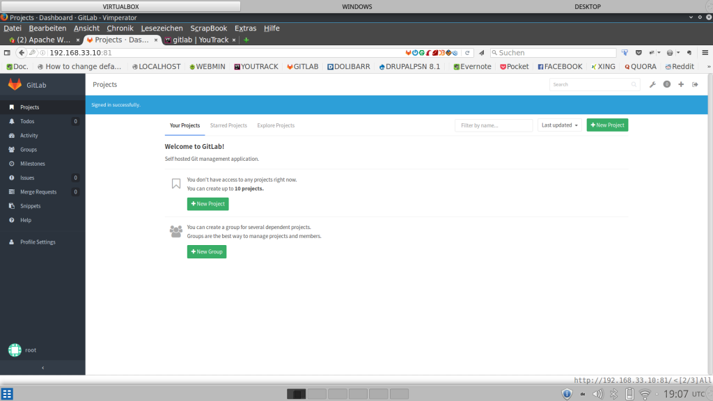 - Gitlab vorinstalliert und läuft auf IP & Port 192.168.33.10:81