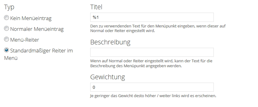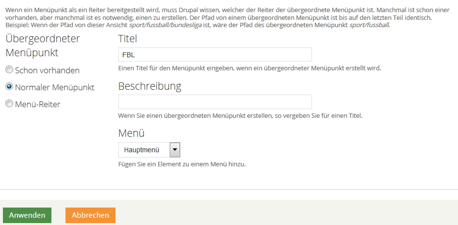 Ich dachte mir, dass ich bei den Menüeinstellungen der View "Standardmäßiger Reiter im Menü" mit dem Titel "%1" auswähle und dann in der nächsten Maske den Übergeordneten Menüpunkt FBL im Hauptmenü eingebe. Ich kriege keinen Fehler ausgespuckt, aber es funktioniert auch nicht so wie ich mir das gedacht habe. Der Menüpunkt "FBL" erscheint zwar im Hauptmenü, aber ohne Unterpunkte. Wenn ich im Menü auf "FBL" klicke, bekomme ich alle Einträge für das Vokabular angezeigt.