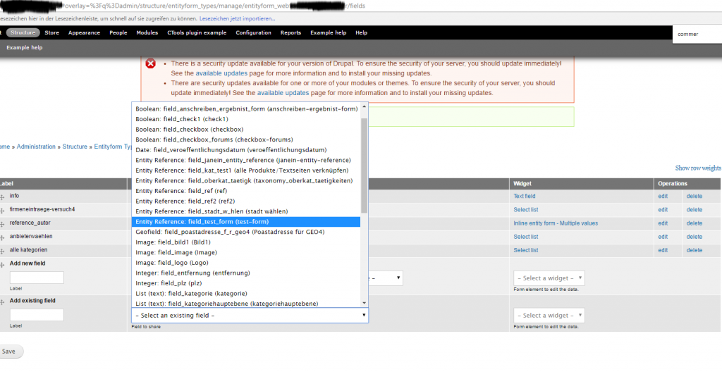 Was ich getestet habe und nicht funktionioniert ist in der Form: Eine "Entity reference" auf ein bestehendes Field setzen, das auch in der Form vorkommt.
