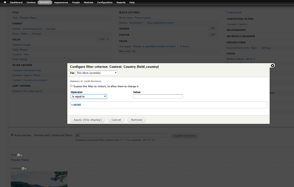 Einen Country Wert dann bei Preview with contextual filters: ...... eingeben ging auch. Er hat mir bei DE z.B. nur deutsche Places angezeigt. Allerdings muss ich ja bei den Filter Criteria bei Country einen Operator und Wert eingeben. Da hatte ich probehalber einfach 'not empty' für den Test gemacht.
