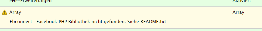 Ich habe jetzt alles soweit drin, aber anscheinend ist die facebook-php-sdk neuer oder einfach eine andere. Sie hat zwar die geforderte Ordner-Struktur. Aber ich bekomme im Statusbericht eine Fehlermeldung, siehe Bild. Und in den Protokollnachrichten steht, unable to load the required facebook-library.
