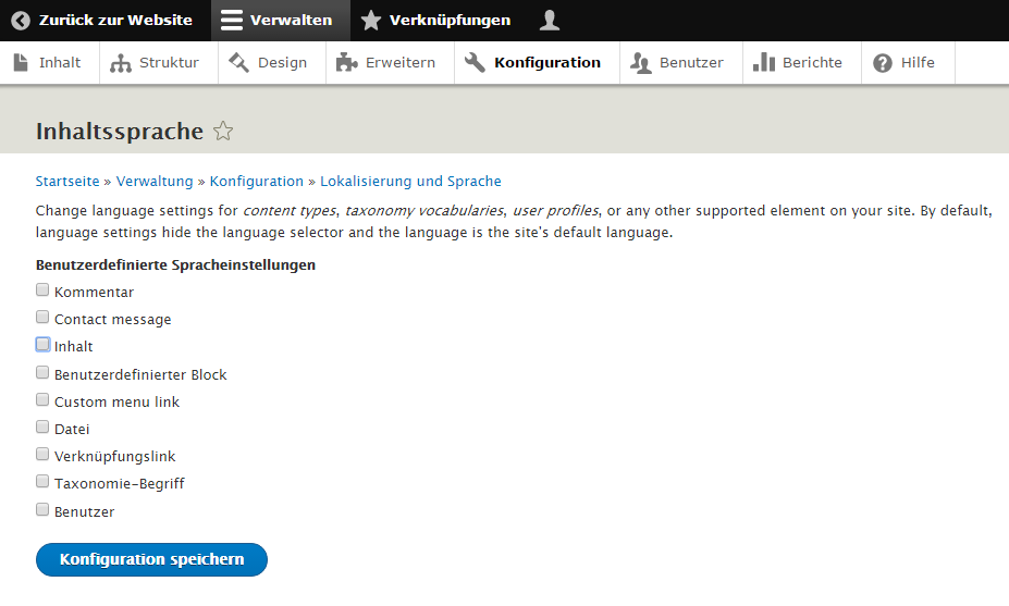 Ich habe mein Drupal 8.2.2 neu aufgesetzt und möchte diesen jetzt für mehrere Sprachen vorbereiten.