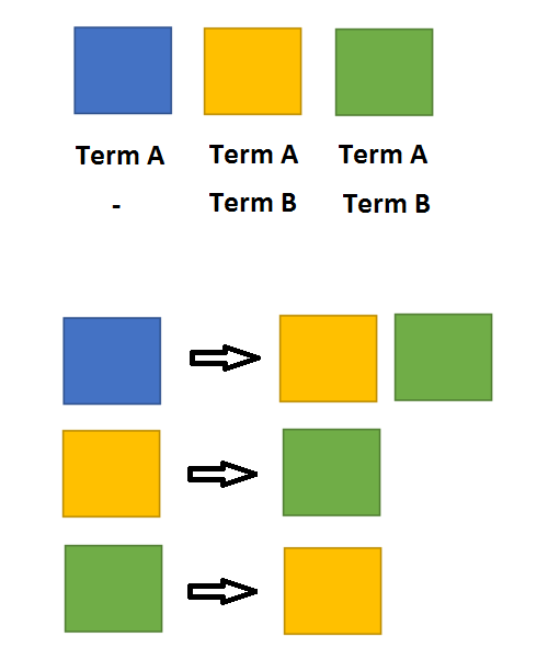 Das Problem ist, dass ich nur die gezeigten Vorschläge beim aufruf der Produkte erhalte. Blau zeigt mir die anderen beiden Produkte mit Term A, aber Gelb und Grün zeigt mir jeweils nur das andere mit Term B getaggte, obwohl sich alle 3 Produkte Term A teilen. Hab ich irgendwo einen Denkfehler oder wo liegt das Problem?