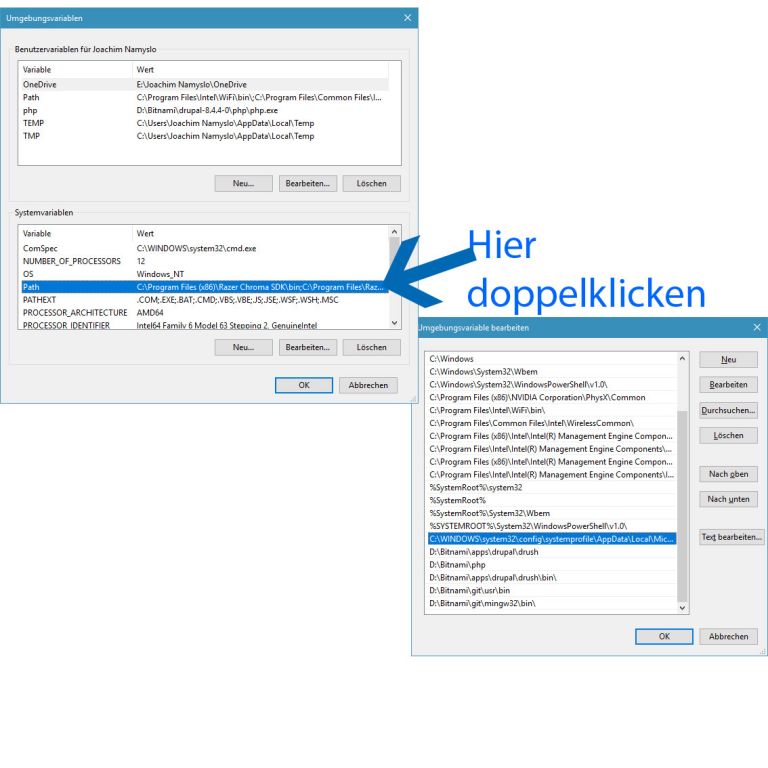 Liege ich richtig, dass es eigentlich darauf ankommt, die 5 Pfade ab C:\WINDOWS System 32\ . . . . nicht in der "Benutzervariablen" sondern in der "Systemvariablen" so zu ändern, wie es in dem Fenster "Umgebungsvariable bearbeiten" zu sehen ist? (Natürlich danach alle Fenster mit "OK" - Befehl schließen). Wenn dem so wäre, dann ist die Sache innerhalb von 3 Minuten erledigt. Licht oder Irrlicht?