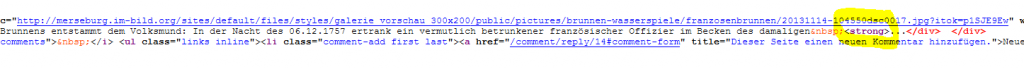 Nachvollziehen könnt ihr es hier: http://merseburg.im-bild.org/fotos/brunnen-wasserspiele (Views-Seite): Dort tauchen im Inhalts-Bereich fette Texte im Bereich der Nodes 7-10 auf, die nicht da sind (vergleiche Entwicklerkonsole [F12] mit Quellcode). Das Gleiche geschieht vor der ID des Fußbereichs (tertiary-content-wrapper,quint-panels-wrapper...).