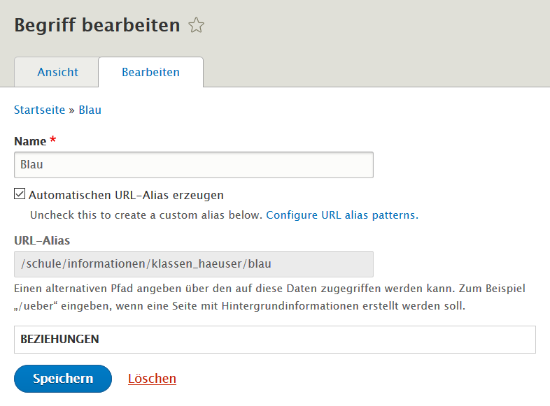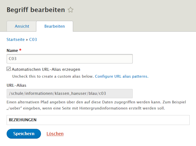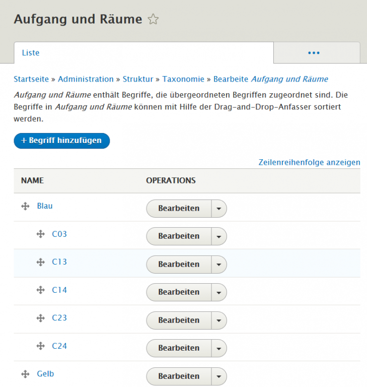 Dann habe ich den View für Taxonomie-Begriffe überschrieben. Der besitzt wie gehabt eine Page auf /taxonomy/term/%, die Taxonomie-Begriffe haben aber Aliase bekommen z.B. /schule/informationen/klassen_aufgaenge/blau/c13 für den Raum C13 im Aufgang blau. Der Standard-View für Taxonomiebegriffe macht jetzt das, was er soll, nämlich: