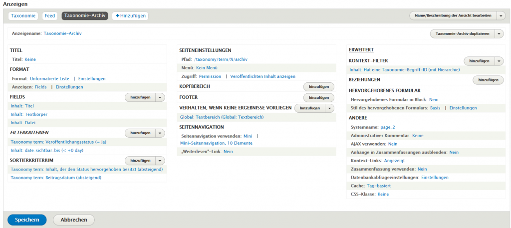 Jetzt bin ich auf die Idee gekommen, dass alte Einträge automatisch in ein Archiv sortiert werden. D.h. ich habe den Taxonomie-View dupliziert und als Filter nur gesetzt, dass das Datum im Feld gültig_bis kleiner sein soll als das aktuelle Datum. Soweit so gut. Nur wie kriege ich jetzt den View dazu, dass er angzeiget wird? Ich hatte mir vorgestellt, dass ich einfach hinter den Begriff ein /archiv anhänge, sowie es bei den Feeds auch ist, aber ich weiß leider nicht wie.