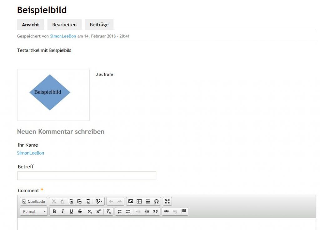Bei einer "Einfachen Seite" ist das Titelbild zu sehen, bei dem neuen Inhaltstypen nicht.