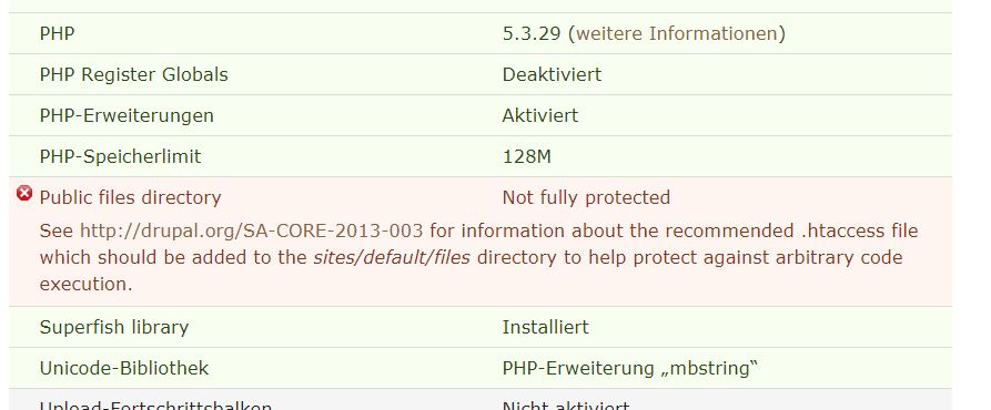 Dann bin ich eben noch auf eine weitere Information gestoßen: Public files directory not fully protected, siehe 2. Screenshot. Es wird empfohlen, eine .htaccess in das Verzeichnis sites/default/files zu senden, über die man weitere Infos hier bekommen soll: