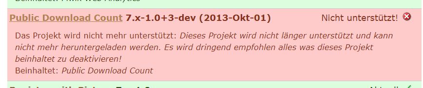 Was der Cronjob macht, weiß ich nicht. Ich hatte vor einigen Jahren mal jemanden beauftragt, eine Funktion in meiner Site einzubauen, die die Downlaodklicks zählt und hinter den downloadbaren Dateien anzeigt. Dafür musste irgendein Cron-Job gestartet werden. Wie gesagt: das ist schon ein paar Jahre her. Und das mit dem Modul "Public Download Count" zu tun, das aber jetzt wohl nicht mehr funktioniert. Siehe Screenshot. Dieses Modul habe ich jetzt deaktiviert und bin gespannt, ob es damit zusammenhing. Gegen 21 Uhr müsste die nächste Mail vom Cron-Job kommen.