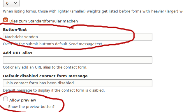 UPDATE: um das Formular abzuschiken definiert mir Drupal ein Button mit "Nachricht senden" und "Vorschau", Vorschau möchte ich komplett weg haben und "Nachricht senden" soll DATEN SENDEN heißen? Welche Möglichkeiten habe ich außer Drupal Core dinge zu ändern?
