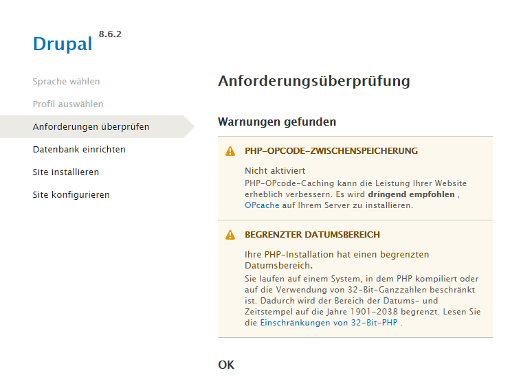 Die Vorgehensweise in ampps sollte sich nicht groß unterscheiden. Soweit ich das sehe ist der OPCache bereits vorinstalliert. Zum aktivieren den OPCache aus kommentieren. d.h. das ";" Semikolon entfernen. Den WebServer neu starten und OPCache sollte in der phpinfo auftauchen. Zur date range deiner PHP Version findest du hier weitere Informationen. Für die lokale Nutzung kannst du diese erst einmal überspringen. Am Seitenende der Drupal 8 Installation gibt es einen Continue Link.