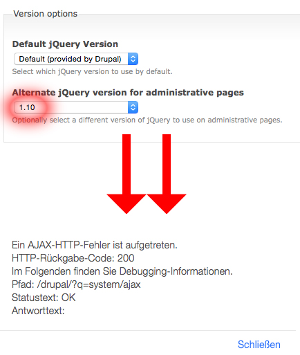 Ich habe heute mal mit den jquery Update-Settings gespielt. Ich nutze die Modulversion 7.x-2.7. Gebracht hat es bislang noch nichts. Die einzige Auffälligkeit ist, dass eine Ajax-Fehlermeldung beim Verschieben der Ansichtsfelder erscheint (siehe Screenshot), wenn man unter "Alternate jQuery version for administrative pages" den Wert "1.10" einstellt.