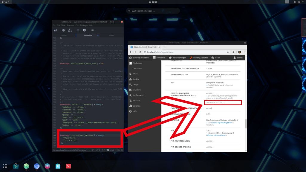 Die Einstellung zu den trusted_host_patterns wird nicht über die settings.php Datei konfiguriert. Dies ist ein Sicherheitsrisiko. Es wird dringend empfohlen die Einstellung zu konfigurieren. Weitere Informationen zum Schutz vor HTTP-Host-Header-Attacken sind in der Online-Dokumentation verfügbar.