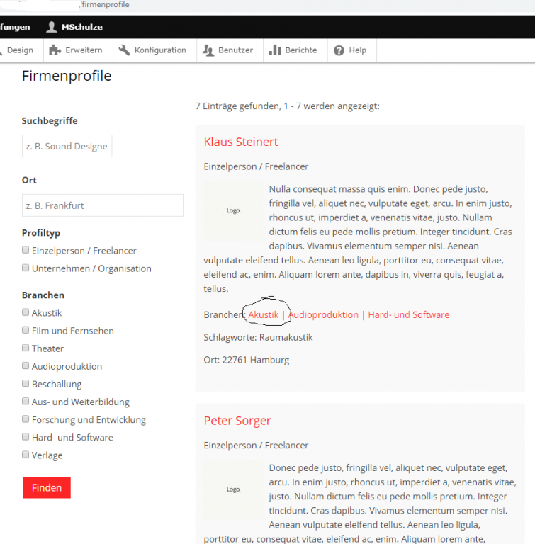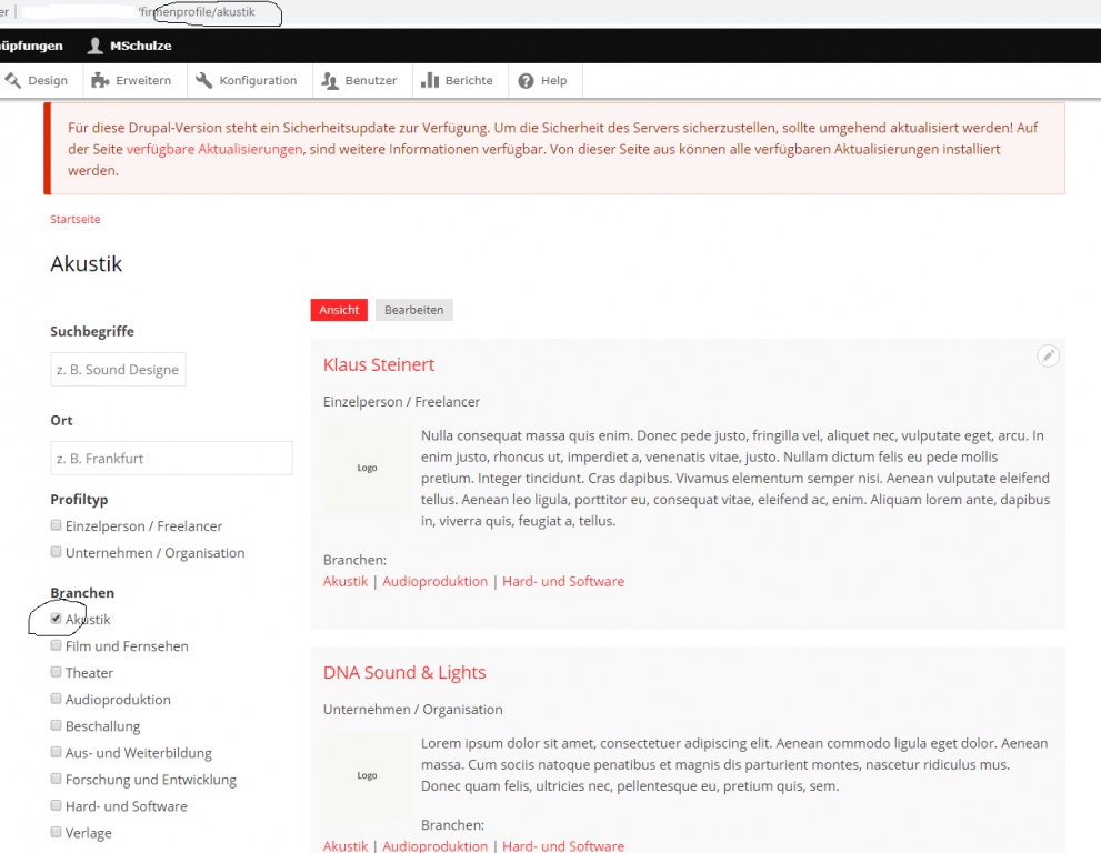 Auch bekomme ich nicht hin, dass wenn man EINEN Filter auswählt (z. B. Akustik), die URL / Ansicht dann obiger entspricht, also mit URL firmenprofile/akustik. Aktuell ist es /firmenprofile?keys=&Ort=&branche%5B36%5D=36.