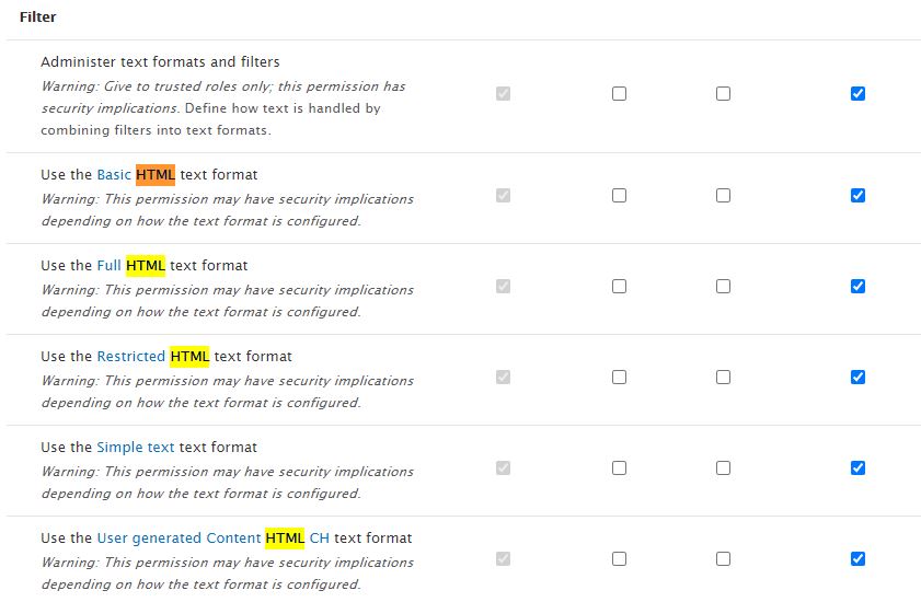 Was ist mit "einmal Rechte vergeben lassen sich nicht mehr Rechte dazu addieren"? Muss ich ggf. irgendetwas grundsätzlich resetten, reicht ein bloßes deaktivieren und aktivieren (also nur einen) der HTML-Filter ggf. nicht aus, um eine Veränderung herbeizuführen?