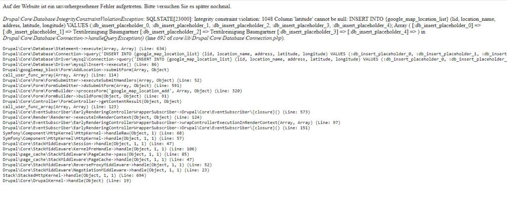 Erst bei der Hinterlegung des Ortes, der angezeigt werden soll (/admin/structure/addlocation, ergaben sich die folgende Fehlermeldung: