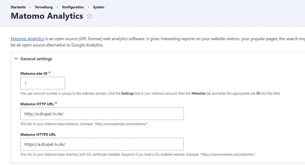 2. Im Modul befindet sich aktuell ein Bug, der den notwendigen / nicht an die Domain für die Matomo-Installaton anhängt Die richtige Eingabe in den beiden Feldern für die Matomo-Installation muss also auf / enden
